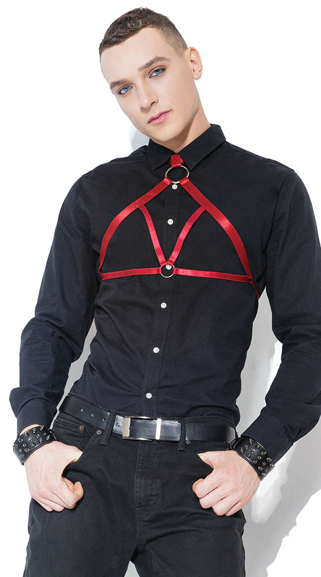 Lleva tus provocaciones a otro nivel con este conjunto de arnés ultra sexy que incluye un sujetador de copa abierta con detalles de aros metálicos, correas tipo halter y una parte inferior de arnés con tiras en la entrepierna abierta a juego con tirantes de liga ajustables, esposas con clip removibles y espalda abierta con botín. correas de marco. Opción de usar este conjunto sobre la ropa. (No incluye empanadas, braguitas ni medias).