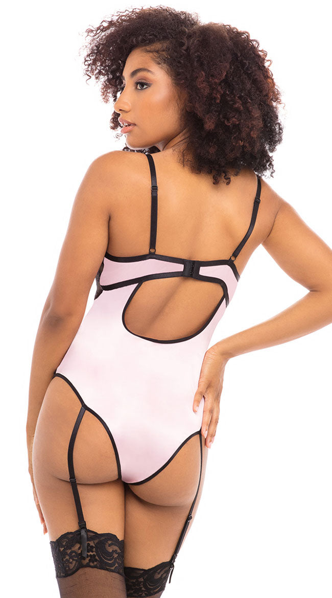 Make your babe's heart beat faster in this flirty teddy featuring pink satin padded underwire cups with contrast eyelash lace inserts, satin bow accents, adjustable spaghetti straps, a hook and eye back closure, a two-tone satin and lace bodice with a small front keyhole, adjustable garter straps, a hook and eye back closure with a keyhole, and a cheeky cut back. (Stockings not included.)
