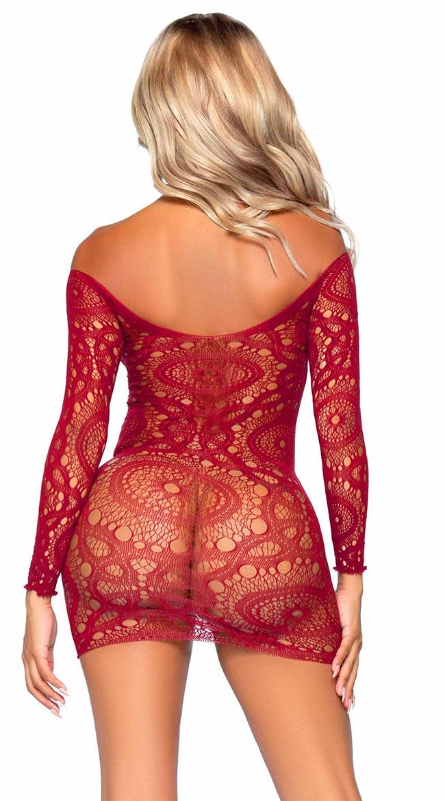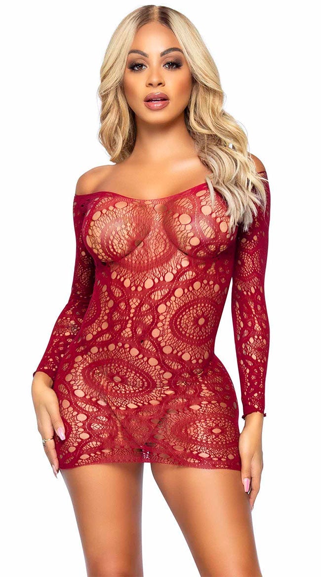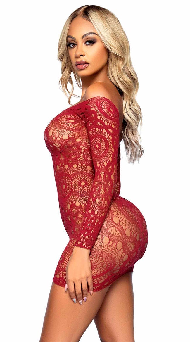 Illuminate your look with this stunning neon dress featuring a high scoop neckline, sheer crochet lace cups, long fitted sleeves, and a curve-hugging fit. (Panty not included.)