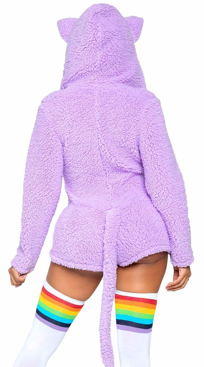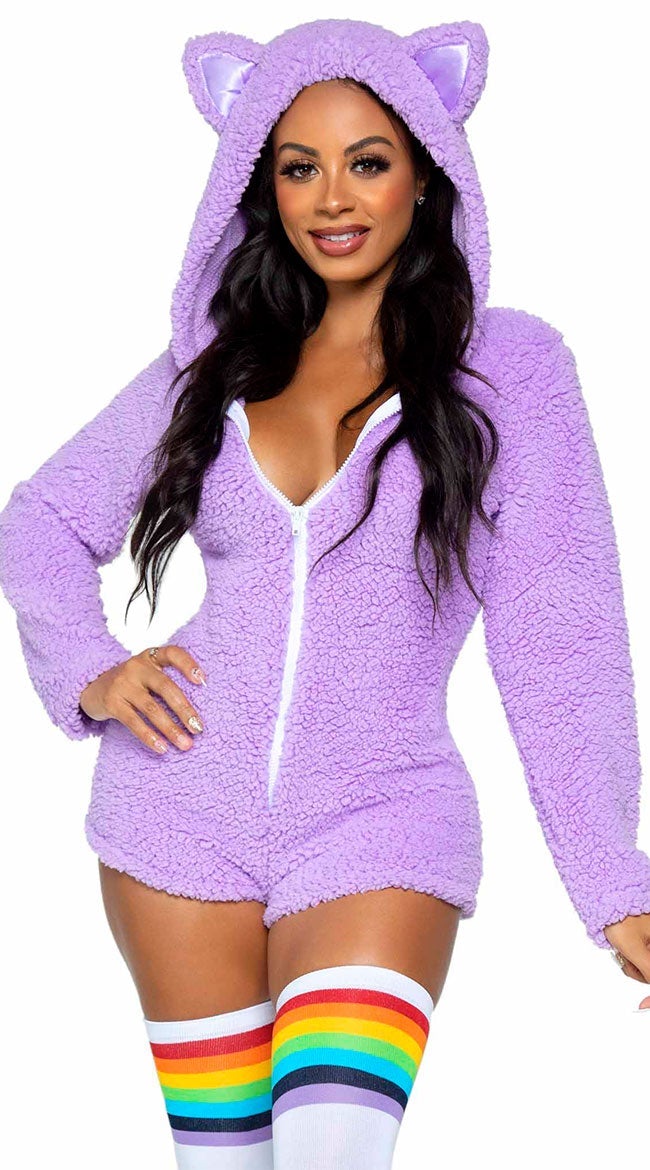Esta fantasia de Cuddle Kitty Babe apresenta um macacão de pelúcia lilás ultramacio com zíper e capuz de orelha de gatinho e cauda de kat anexada
