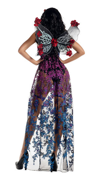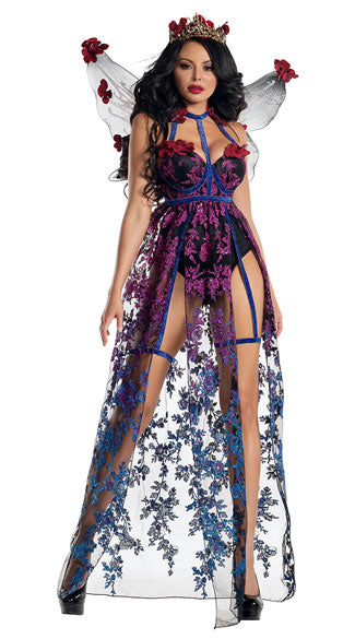 Domine seu reino volátil com esta fantasia de Dark Fairy Queen com um macacão preto com copas com armação, uma saia longa e transparente com fendas frontais altas, detalhes de renda ombre roxo a azul, gola alta com tiras de arnês azuis brilhantes, apliques de pétalas de rosa vermelhas, um fechamento com zíper traseiro, tiras de liga azuis com ligas de perna envolventes anexadas, um corte atrevido nas costas e asas transparentes combinando. (Coroa não incluída.)
