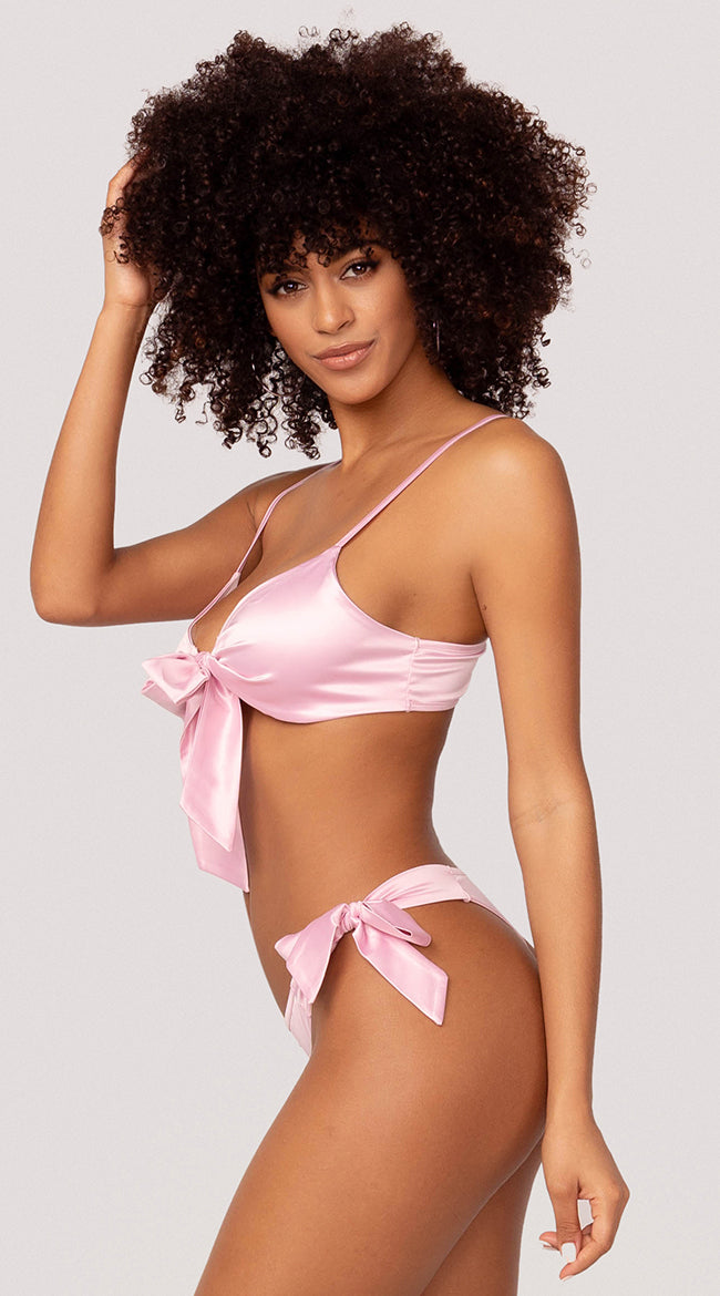 Mime-se com o luxo neste conjunto de sutiã exclusivo com copas de cetim macias com fecho frontal de gravata, alças finas ajustáveis e uma calcinha combinando com fechos laterais e um corte de tanga nas costas.