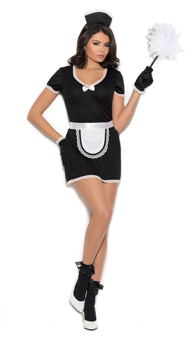 Faça o seu Halloween brilhar com esta fantasia de Maid To Clean com um minivestido preto com decote redondo e detalhes em renda branca, um avental branco com um laço de cetim, um chapéu de empregada e luvas pretas. (Meias de tornozelo, espanador e sapatos não incluídos).